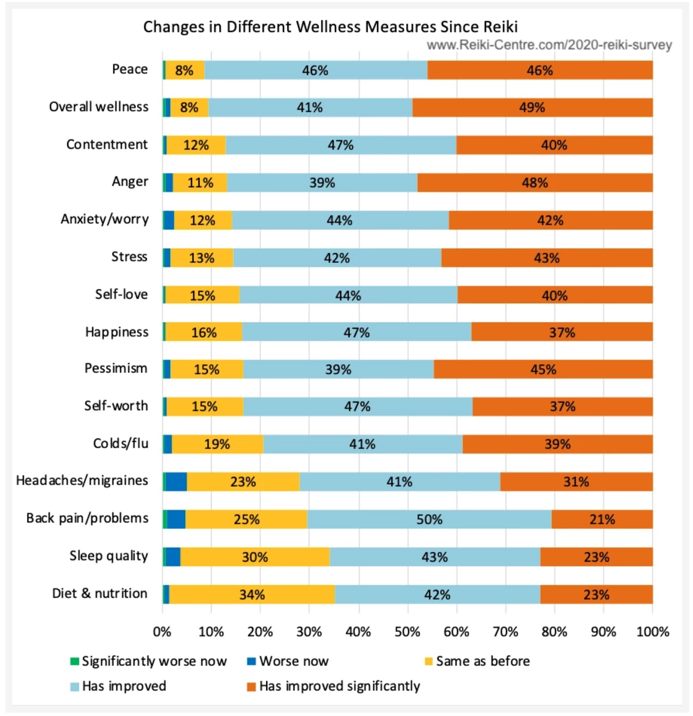 Une grande enquête internationale vient d’être réalisée par « The Reiki Center ». Nous pensons qu'il s'agit de la plus grande enquête sur le Reiki auprès des consommateurs à ce jour, avec 1288 répondants couvrant 68 pays. Notre objectif est de quantifier les avantages du Reiki tels que rapportés par ses utilisateurs et d'examiner tous les facteurs clés de succès dans l'utilisation du Reiki pour des résultats plus significatifs.